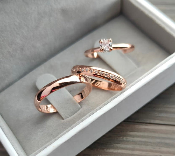 Par de alianças banhadas em ouro rose gold, 4mm, anatômicas, feminina com meia volta de zircônias cravejadas.