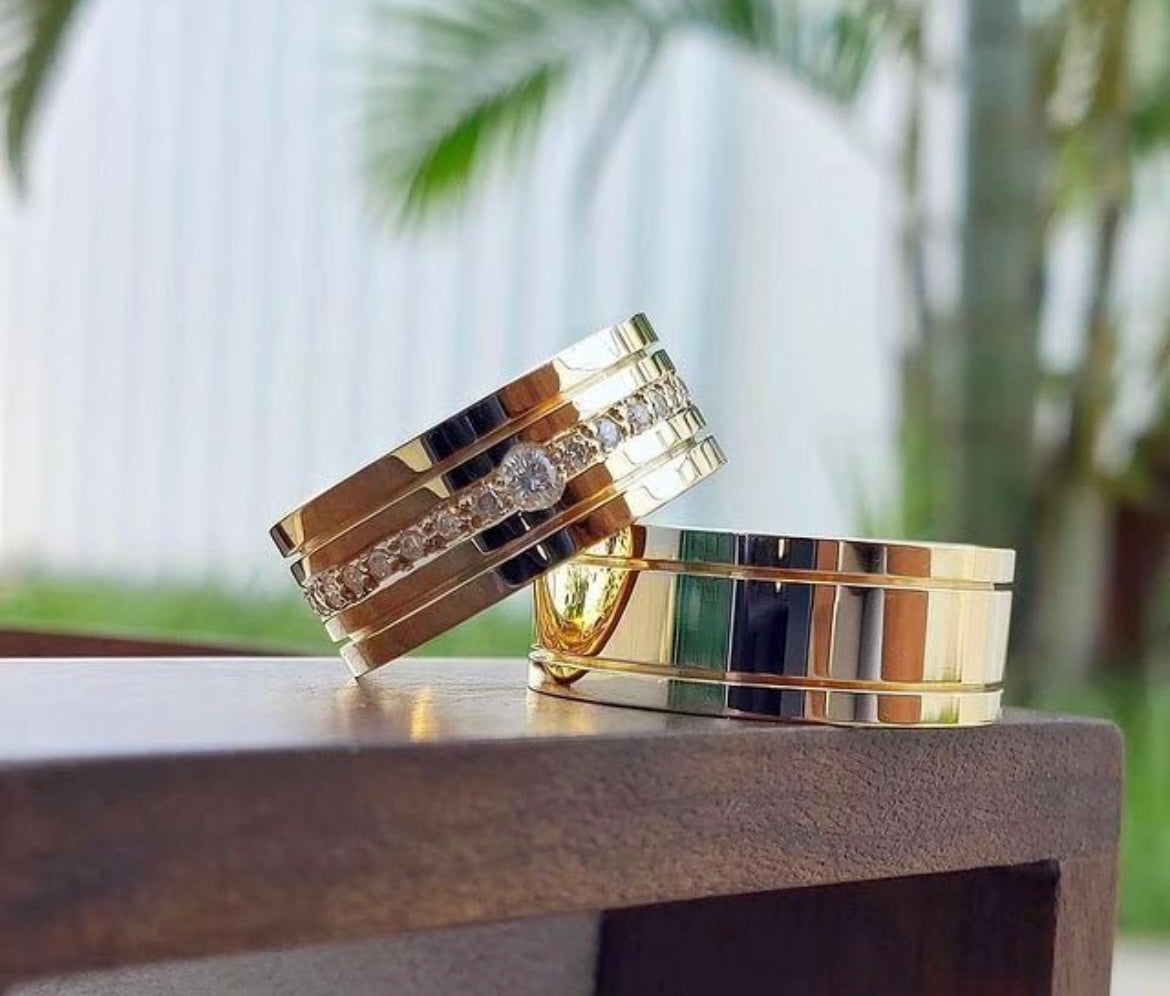 Par de alianças em moeda antiga legítima, 8mm de largura, anatômicas, feminina com meia volta de zircônias cravejadas.  ANEL SOLITÁRIO DE BRINDE (anel tradicional) 10 dias úteis para a confecção. Para adicionar forro de prata...