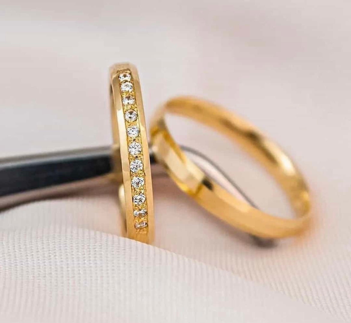 Par de alianças em moeda antiga legítima, 3mm de largura, anatômicas, feminina com meia volta de zircônias cravejadas.  ANEL SOLITÁRIO DE BRINDE  Para adicionar forro de prata ou aço, entrar em contato, via WhatsApp, acréscimo...