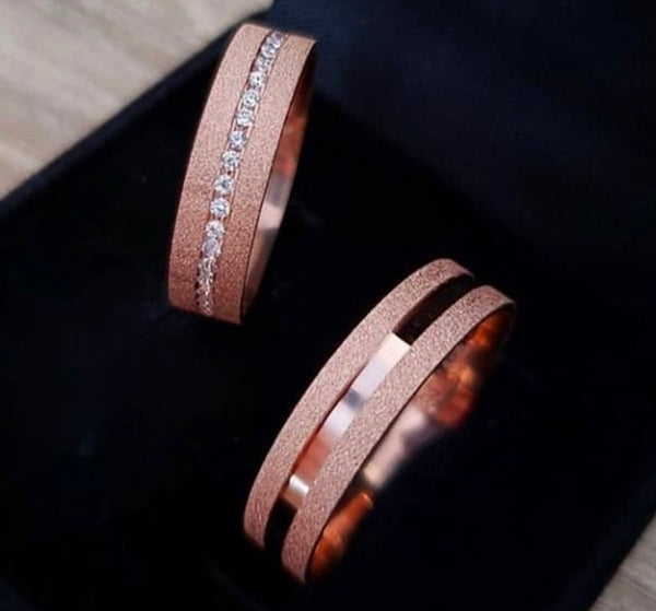 Par de alianças banhadas em ouro rose gold, 5mm, anatômicas, feminina com meia volta de zircônias cravejadas.