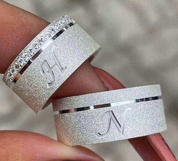 Par de alianças em prata 950 legítima, 10mm de largura, retas, anatômicas, feminina com meia volta de pedras de zircônia cravejadas, ambas com letras do casal gravadas.
