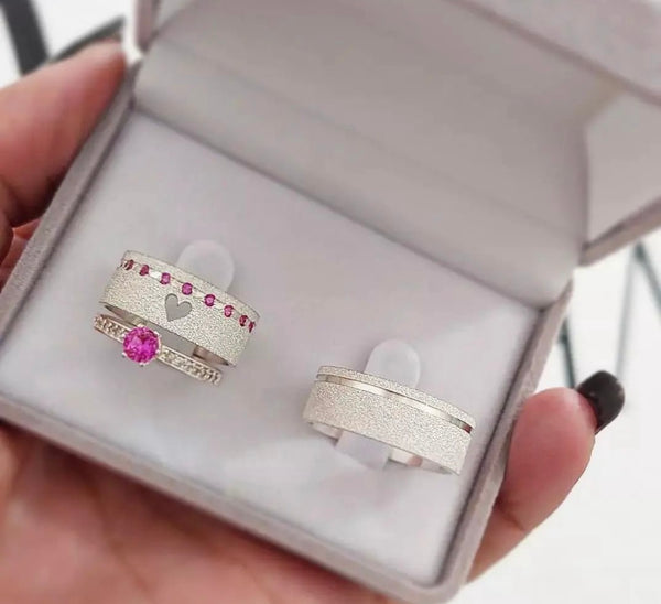 Par de alianças em prata 950 legítima, 8mm de largura, retas, anatômicas, feminina com meia volta de zircônias cravejadas e coração vazado.