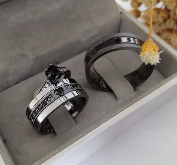 Par de alianças de Prata com Banho de Ródio Negro em 7mm, feminina com coração e meia volta de pedras de zircônia cravejado.