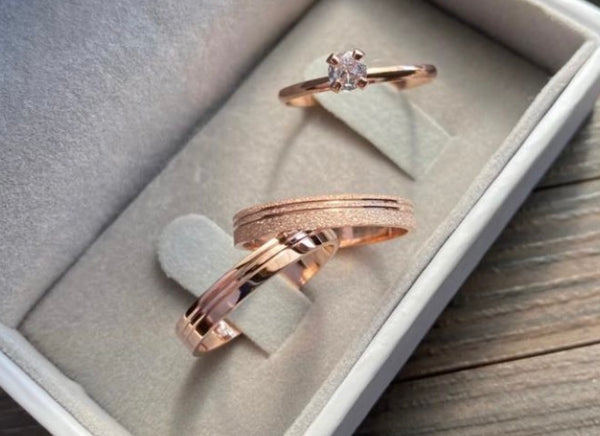 Par de alianças banhadas em ouro rose gold, 4mm, anatômicas.