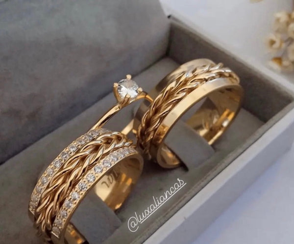 Par de alianças em moeda antiga legítima, 6mm de largura, anatômicas, trançada, feminina com duas meia voltas de pedras de zircônia cravejadas.  ANEL SOLITÁRIO DE BRINDE  Para adicionar forro de prata ou aço, entrar em...